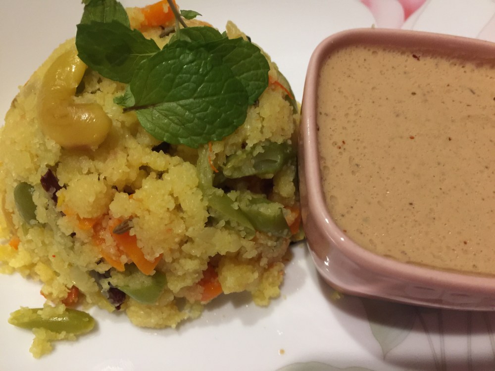 Rava Kichidi with loads of carrots , French beans , green peas and cashews and spicy chutney of your choice can double up as a heavy and satisfying breakfast option or as easy to carry lunch box option or as a light yet fulfilling dinner option.